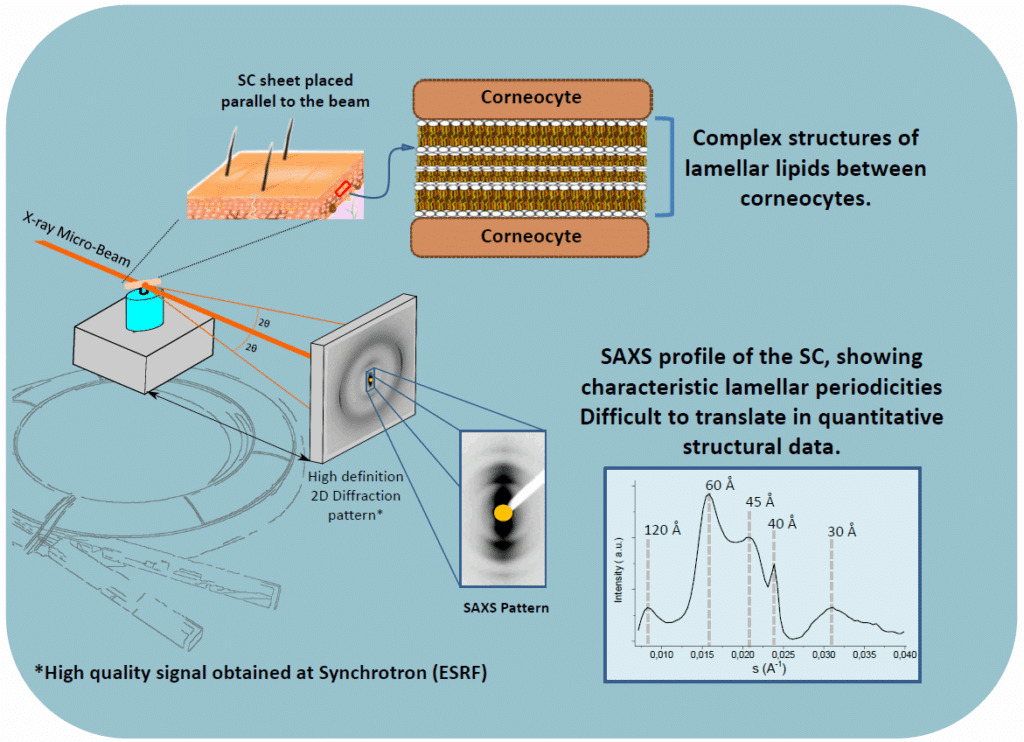 Small angle X-ray scattering (SAXS) is a powerful technique able to provide a signal characteristic of the lamellar intercellular lipid matrix of the Stratum Corneum (SC). Compared to Electronic microscopy (EM), SAXS requires a simple sample preparation and provides global information of the lamellar structures within the SC, while EM is restricted to mostly local analysis. The main obstacle to use this technique lies in the interpretation of the diffraction signal, resulting in the under exploitation of the data.