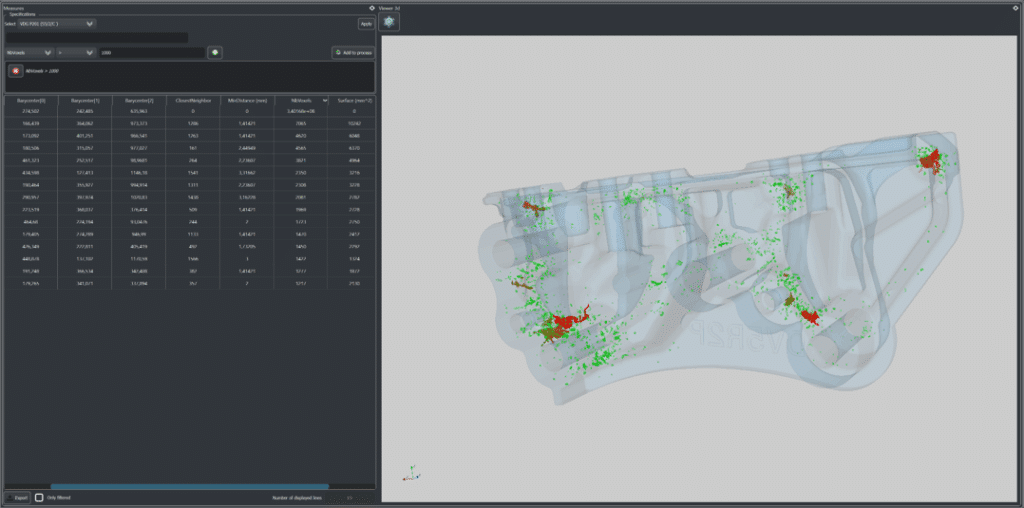 Une perspective d’un volume tomographique avec des volumes segmentés et des mesures dimensionnelles.